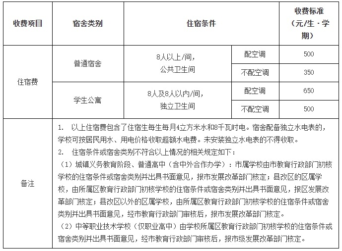 农村义务教育阶段免收住宿费。城镇义务教育阶段、普通高中(含中外合作办学)及中等职业技术学校(仅职业高中)住宿费实行政府定价(政府指导价),具体如下: