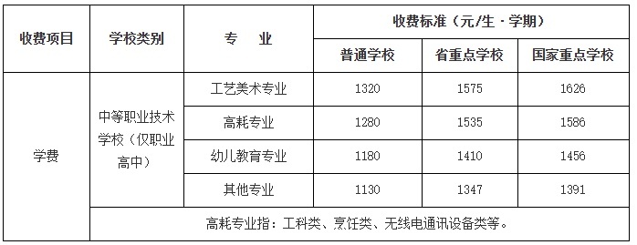 中等职业技术学校(仅职业高中)收费方面,收费项目包括学费、住宿费、服务性收费、代收费。